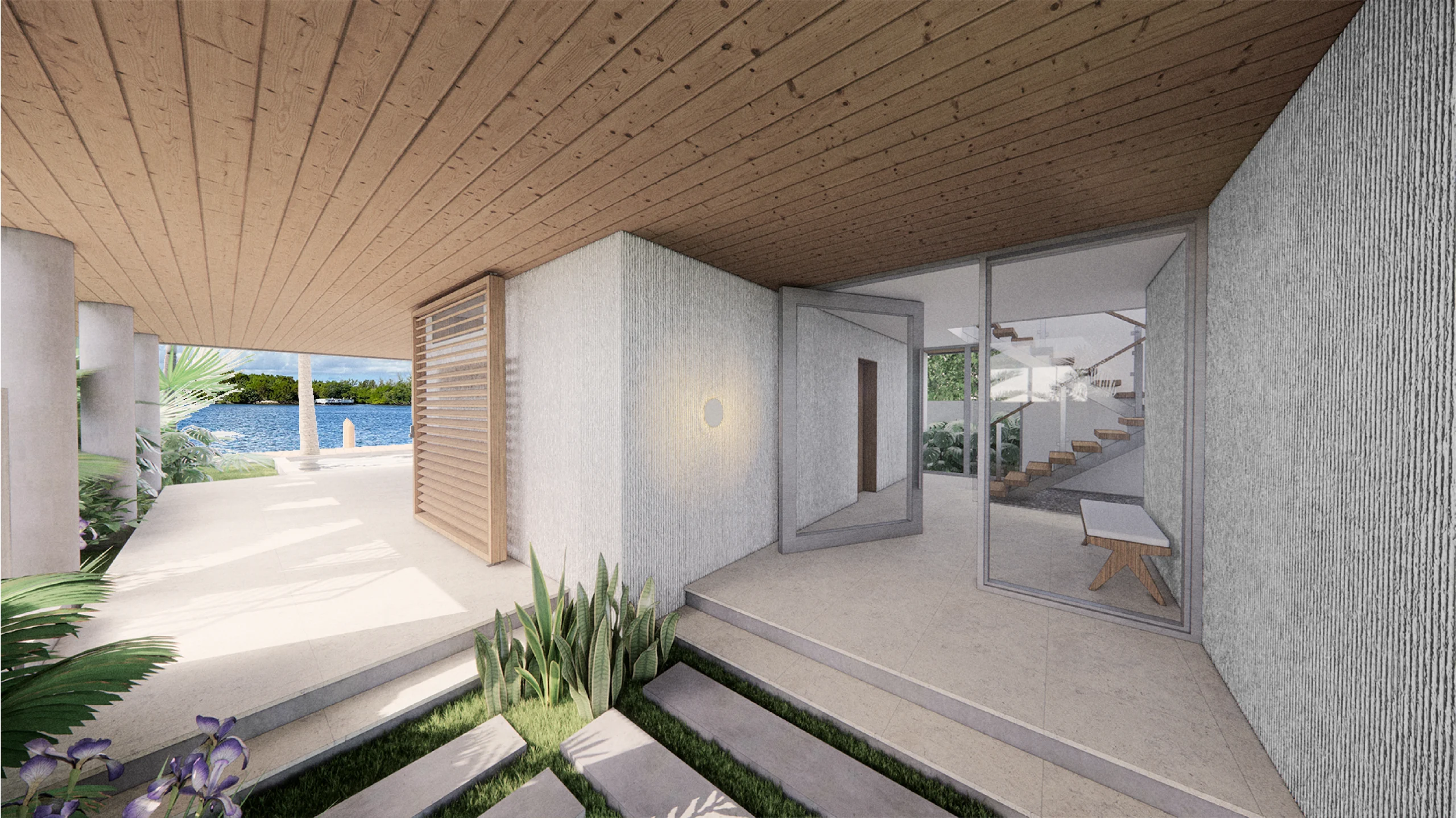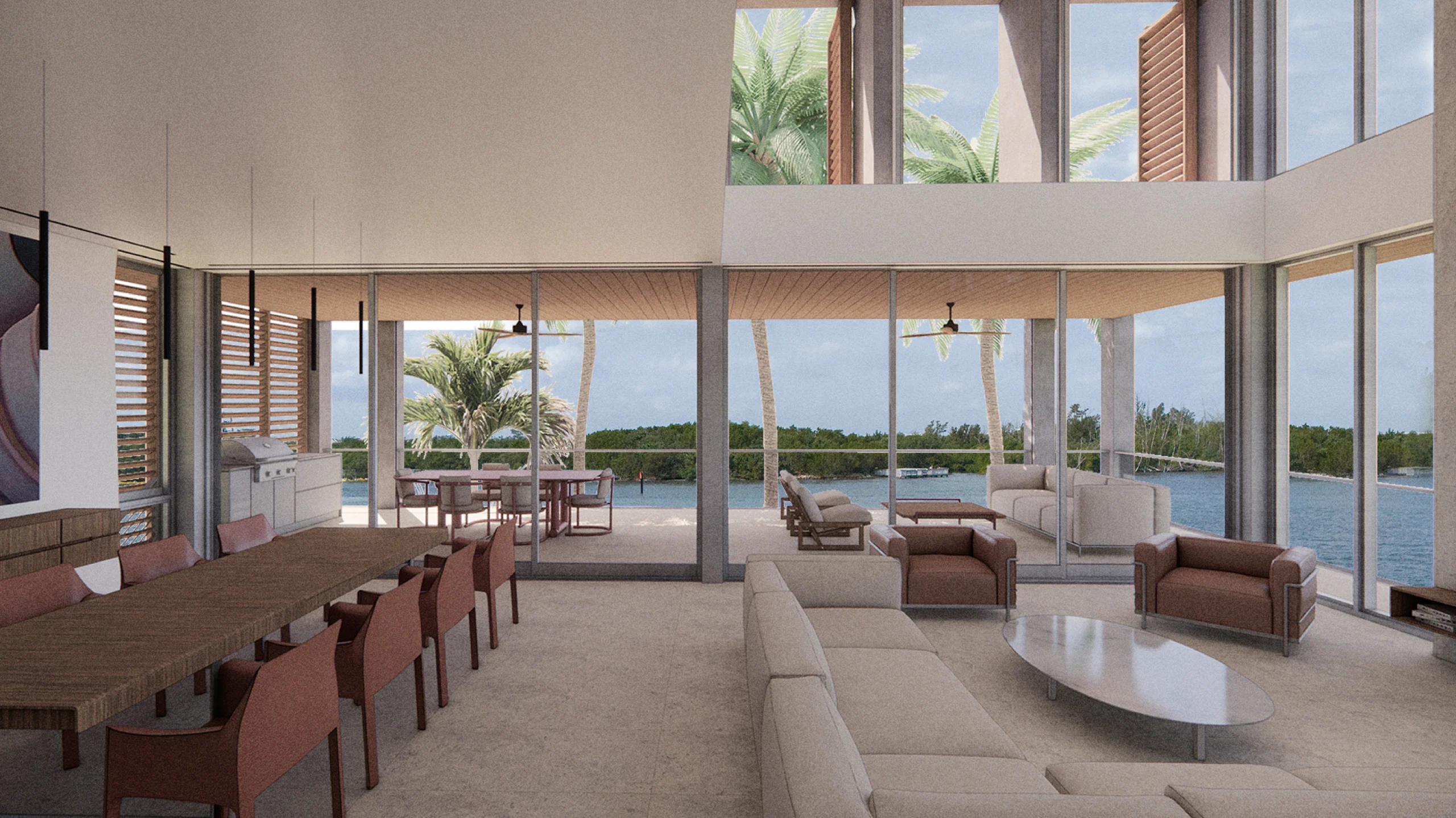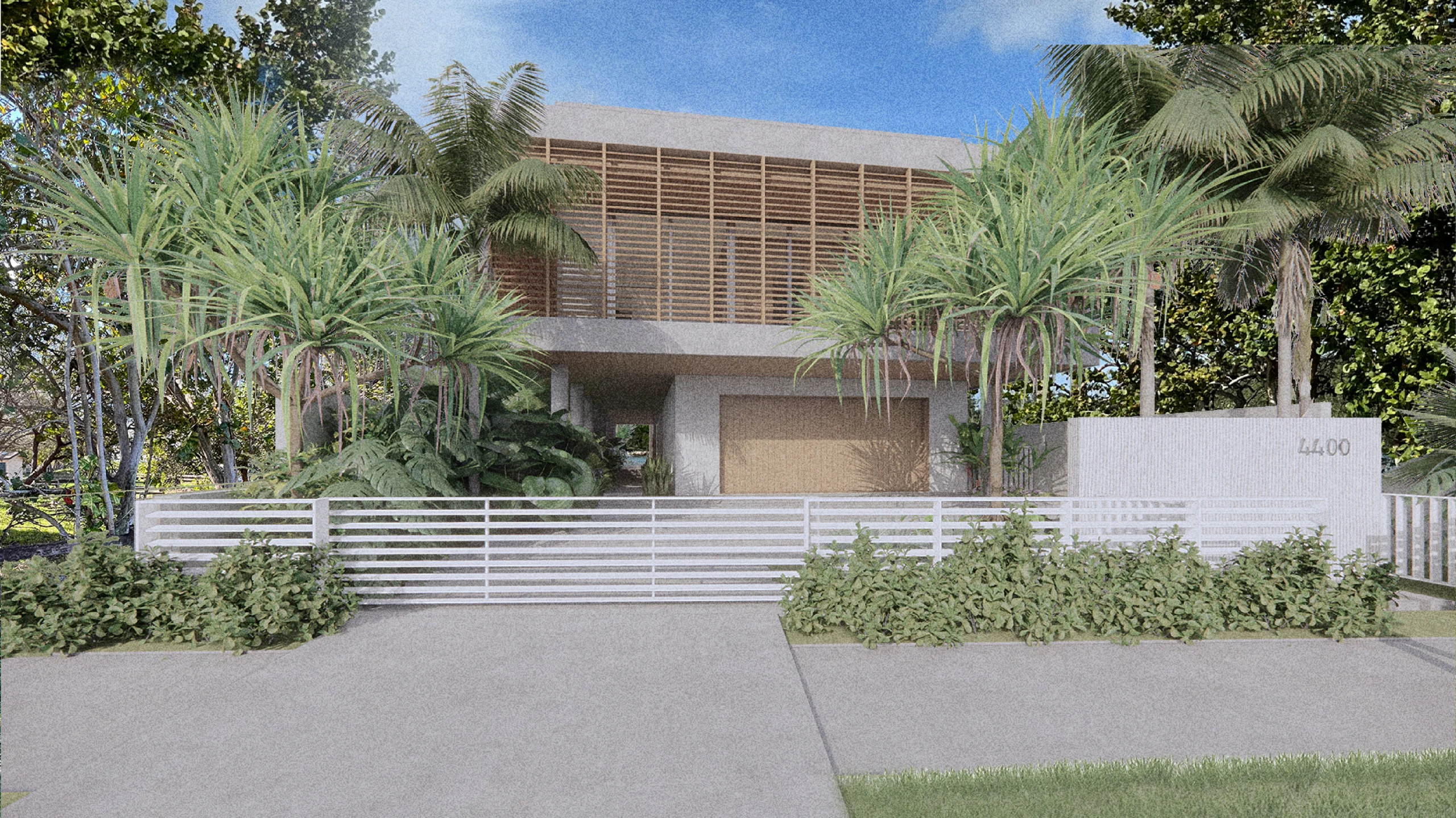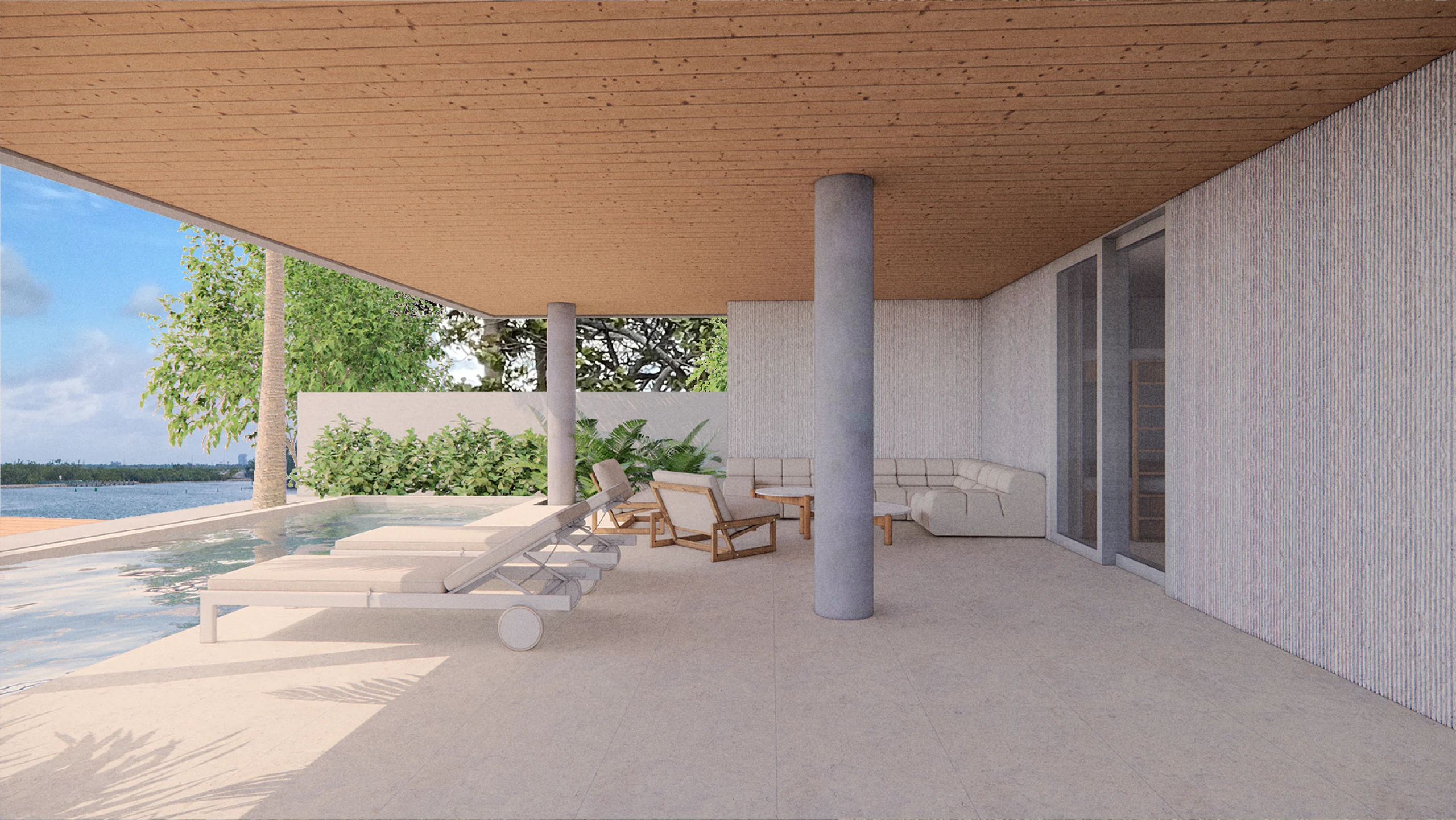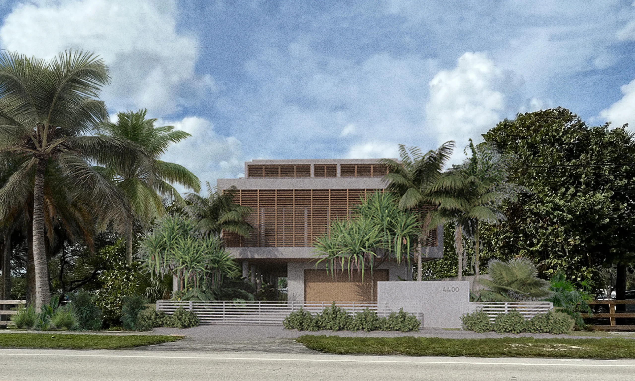 PRIVACY AND RESILIENCE WERE THE HIGHEST PRIORITIES FOR THIS HOME. THE UNIQUE SITE SITS BETWEEN TWO WELL USED PUBLIC PARKS, A BUSY STATE HIGHWAY AND THE BUSTLING INTRACOASTAL WATER WAY. THE SITE’S BACKYARD ALSO FACES DUE WEST, ADDING ADDITIONAL CHALLENGES FOR MITIGATING THE INTENSE AFTERNOON SUN WITHOUT COMPLETELY BLOCKING VIEWS OF THE WATER AND THE NATURE PRESERVE BEYOND. FOR BOTH PRIVACY AND SUN MITIGATION, A SERIES OF SCREENS WERE DESIGNED TO WRAP AROUND THE OUTER SHELL OF THE HOUSE ALONG THE EAST, SOUTH AND NORTH FACADES. THE WEST IS LEFT OPEN TO VIEWS AND EMPLOYS DEEP OVERHANGS TO CAST LONG SHADOWS ON THE MAIN BALCONY AND POOL AREA. THROUGH STRATEGIC LANDSCAPING, MATERIAL SELECTIONS AND DEEP OVERHANGS, THE HOUSE REMAINS LIGHT AND AIRY WHILE ALSO WELL SHADED FROM THE HEAT OF THE AFTERNOON SUN.