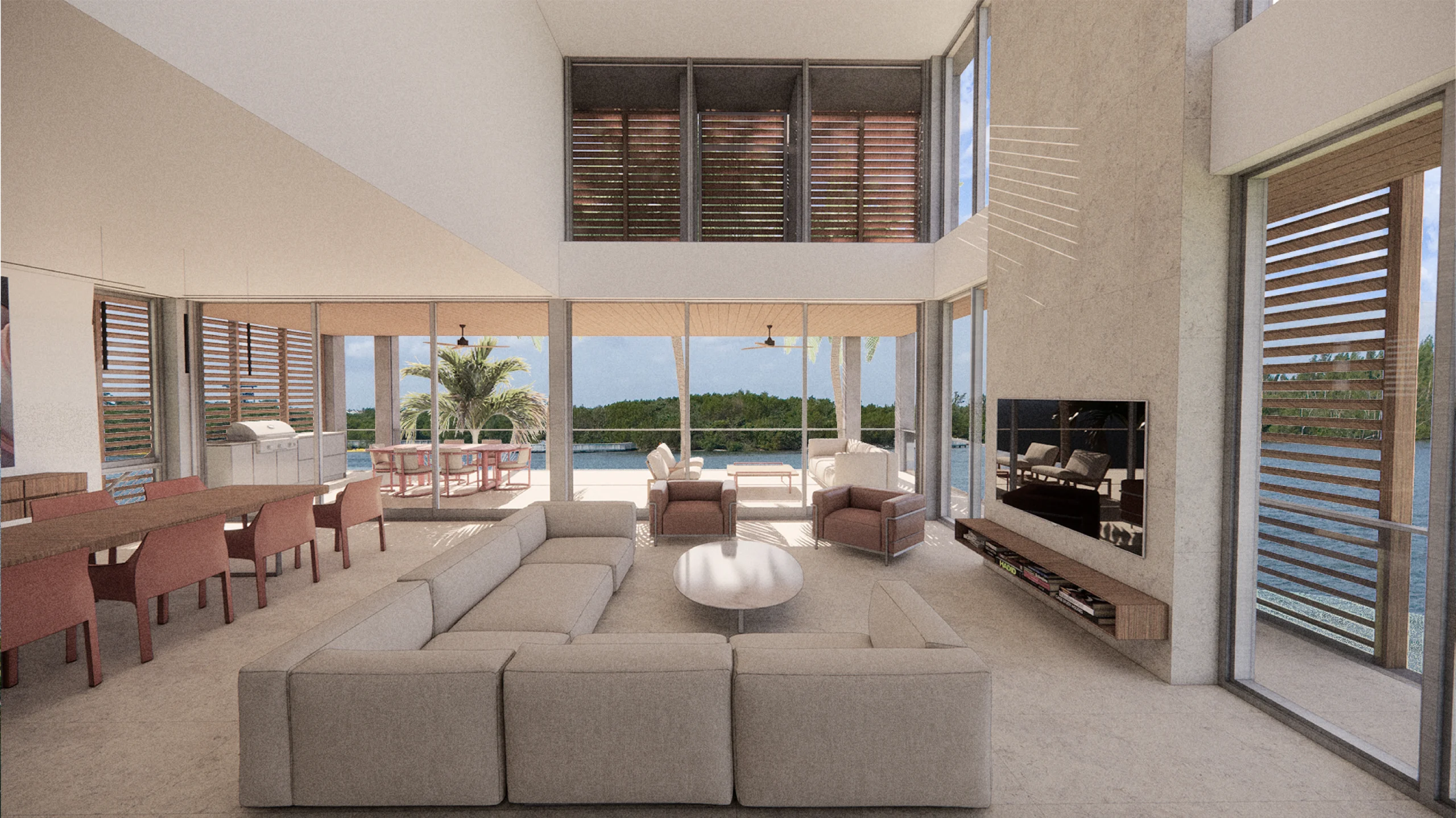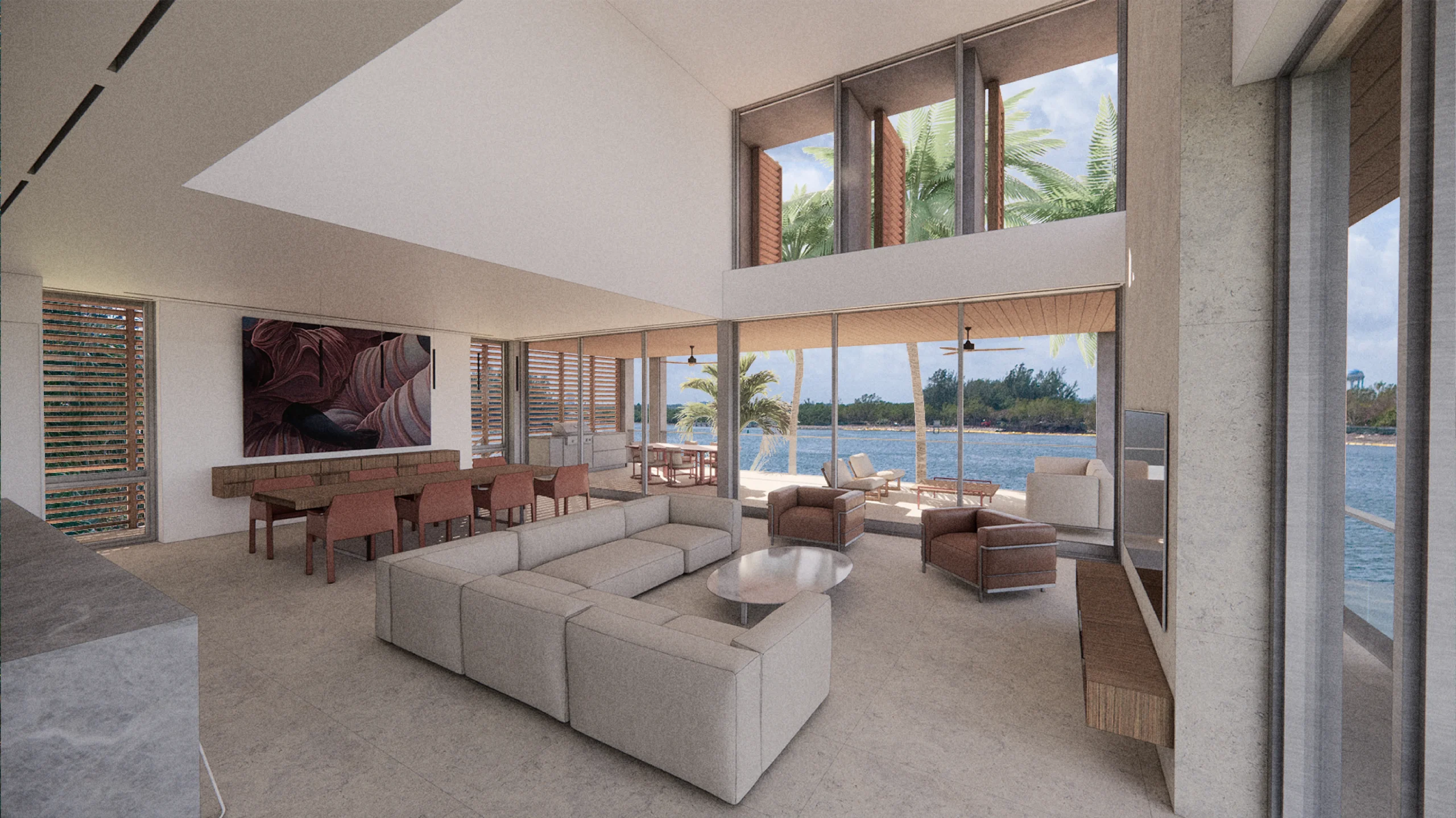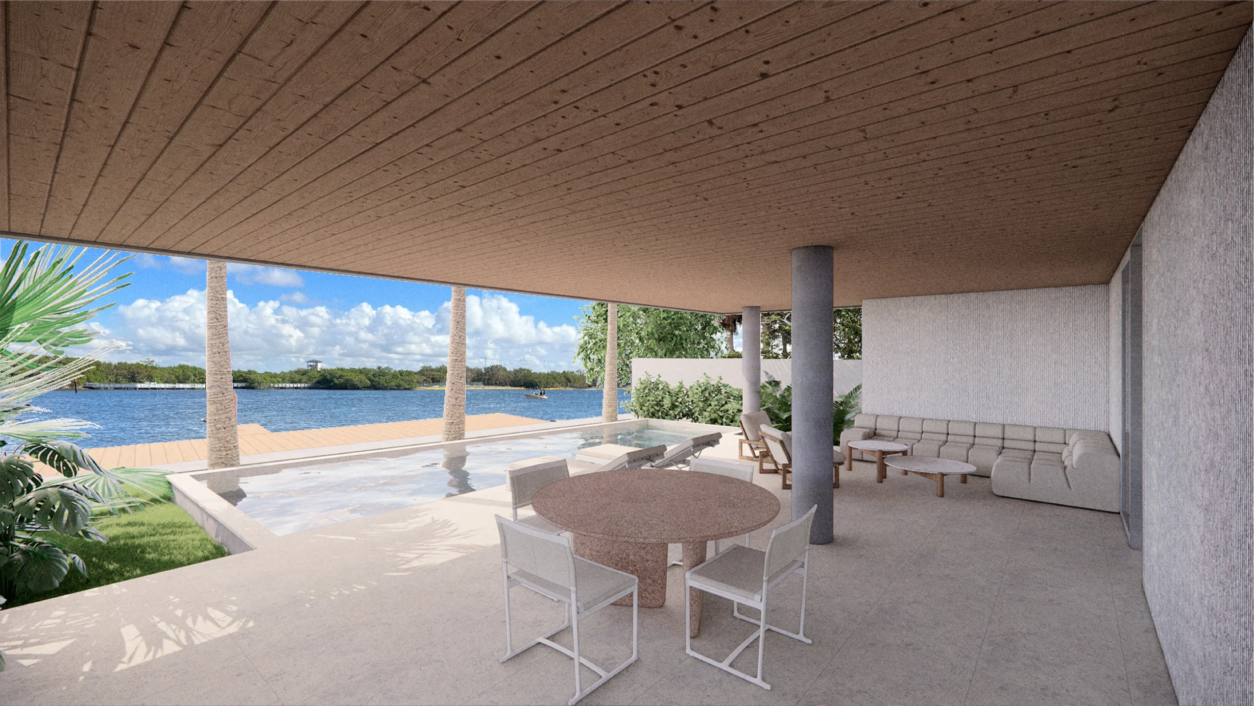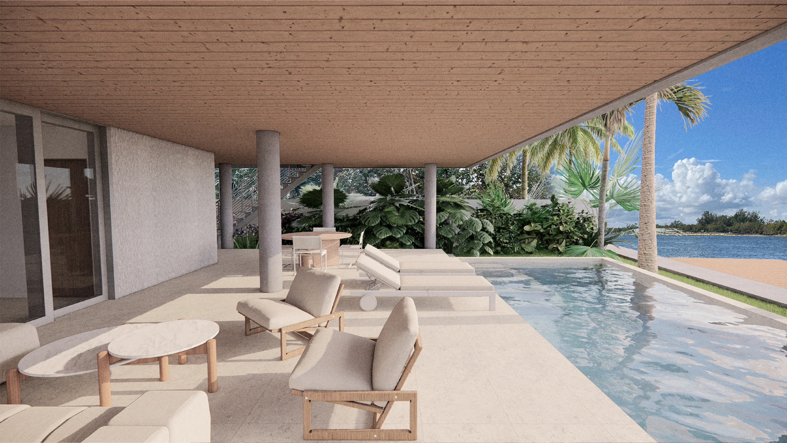 PRIVACY AND RESILIENCE WERE THE HIGHEST PRIORITIES FOR THIS HOME. THE UNIQUE SITE SITS BETWEEN TWO WELL USED PUBLIC PARKS, A BUSY STATE HIGHWAY AND THE BUSTLING INTRACOASTAL WATER WAY. THE SITE’S BACKYARD ALSO FACES DUE WEST, ADDING ADDITIONAL CHALLENGES FOR MITIGATING THE INTENSE AFTERNOON SUN WITHOUT COMPLETELY BLOCKING VIEWS OF THE WATER AND THE NATURE PRESERVE BEYOND. FOR BOTH PRIVACY AND SUN MITIGATION, A SERIES OF SCREENS WERE DESIGNED TO WRAP AROUND THE OUTER SHELL OF THE HOUSE ALONG THE EAST, SOUTH AND NORTH FACADES. THE WEST IS LEFT OPEN TO VIEWS AND EMPLOYS DEEP OVERHANGS TO CAST LONG SHADOWS ON THE MAIN BALCONY AND POOL AREA. THROUGH STRATEGIC LANDSCAPING, MATERIAL SELECTIONS AND DEEP OVERHANGS, THE HOUSE REMAINS LIGHT AND AIRY WHILE ALSO WELL SHADED FROM THE HEAT OF THE AFTERNOON SUN.