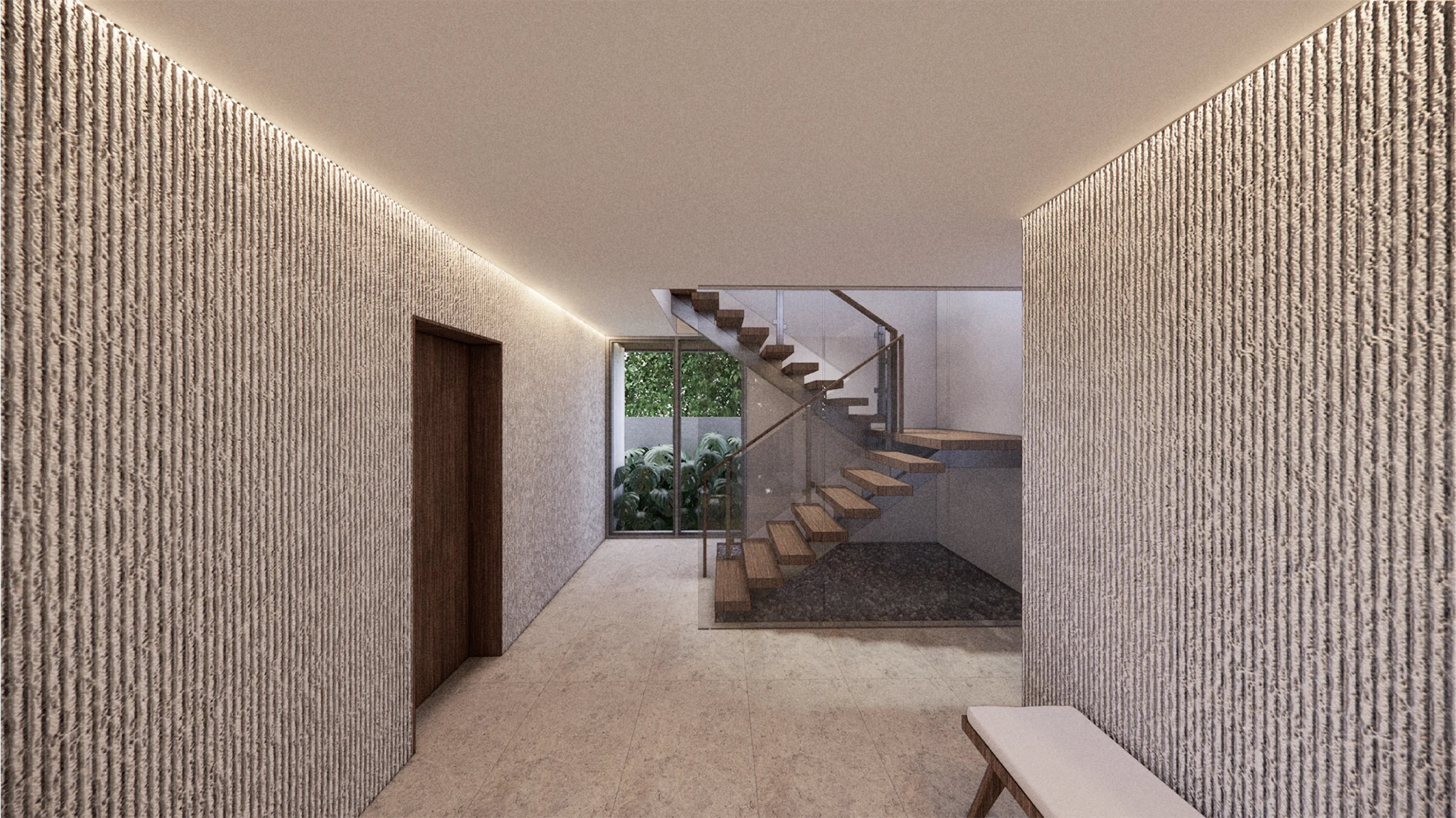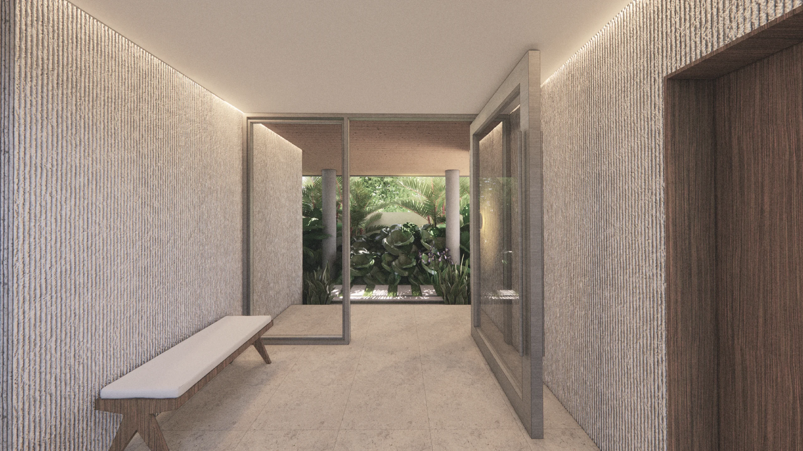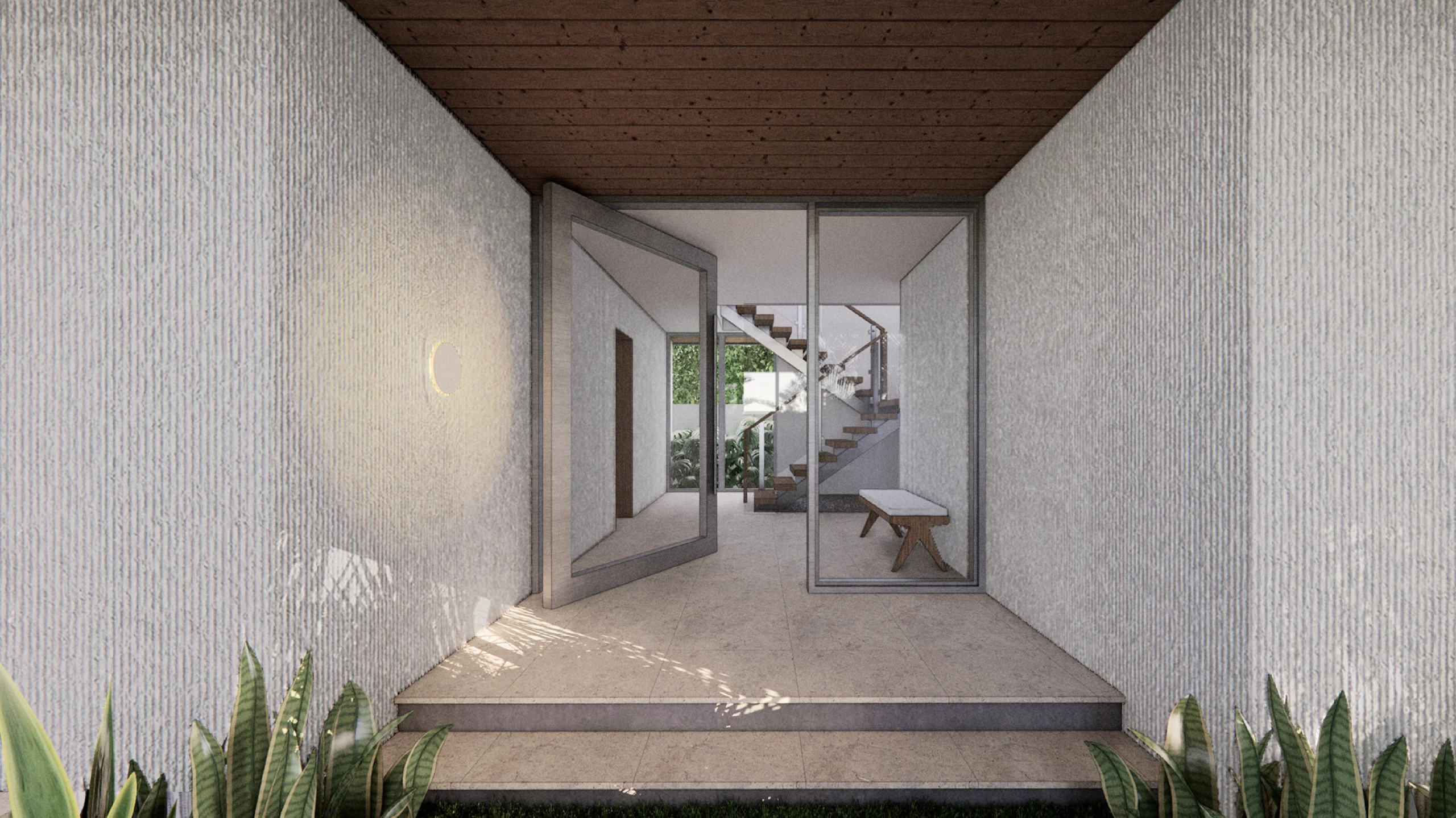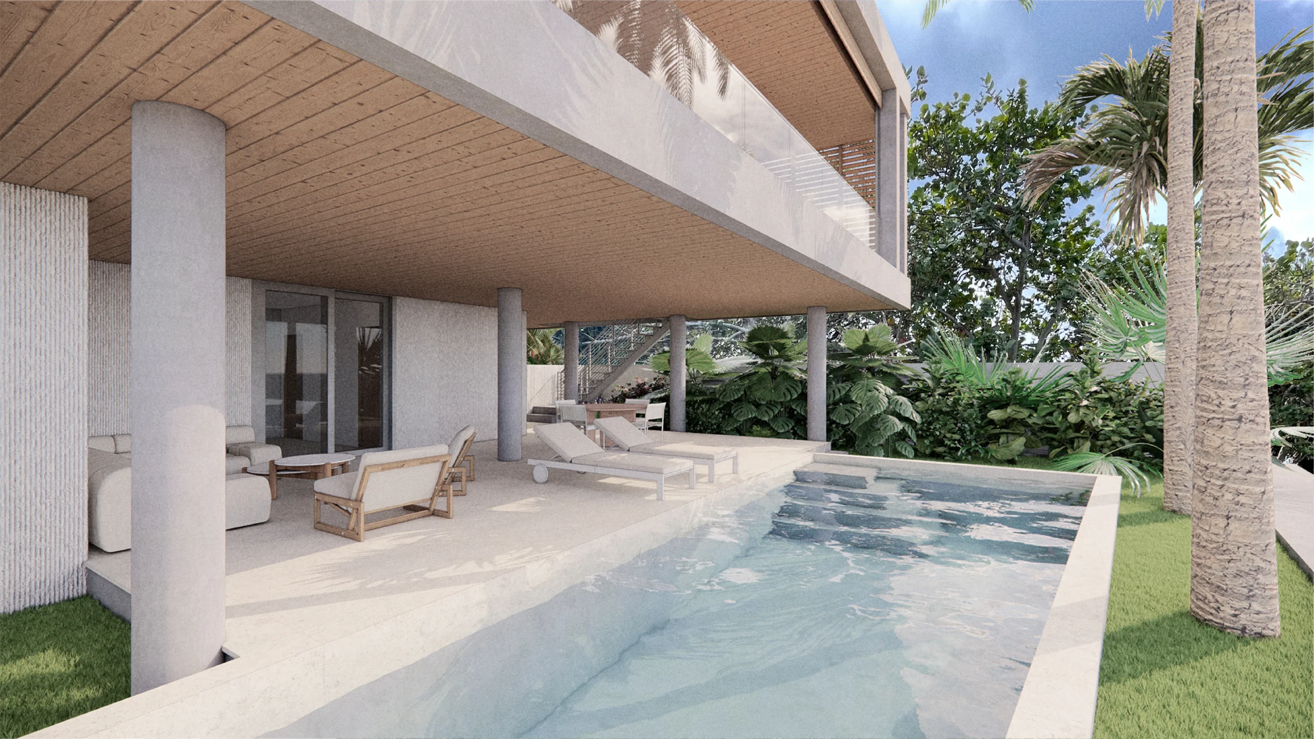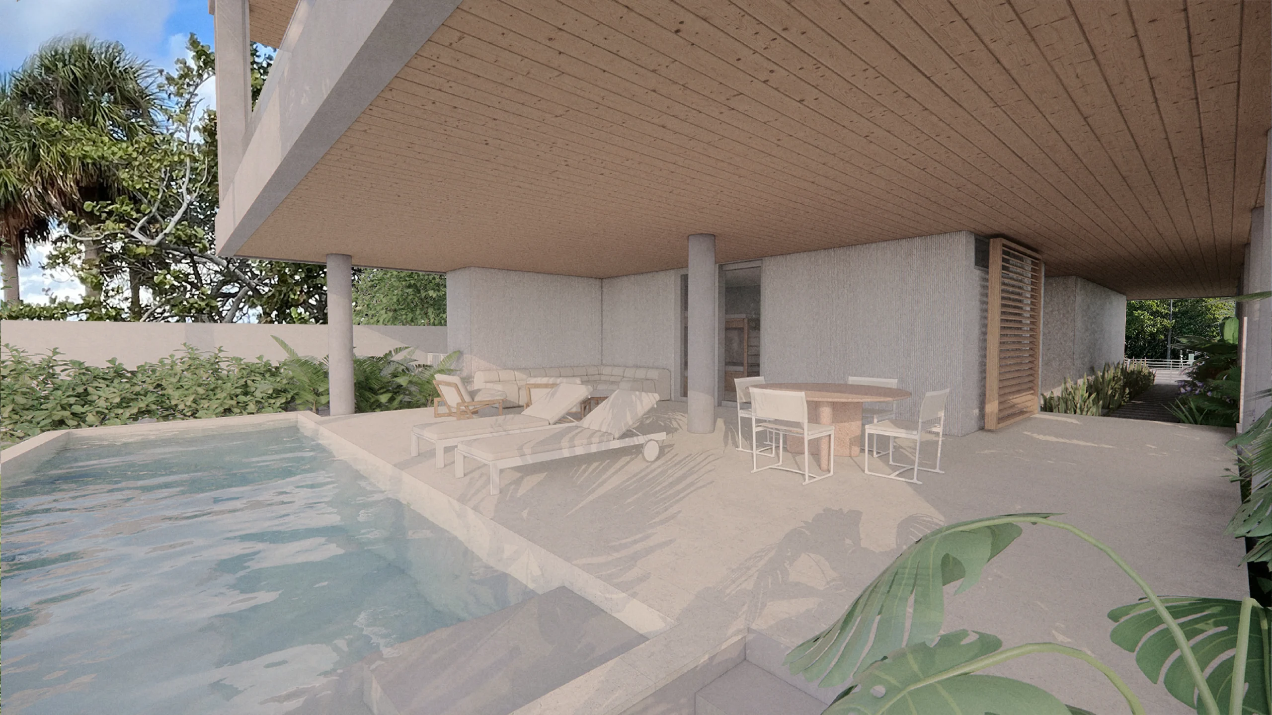 PRIVACY AND RESILIENCE WERE THE HIGHEST PRIORITIES FOR THIS HOME. THE UNIQUE SITE SITS BETWEEN TWO WELL USED PUBLIC PARKS, A BUSY STATE HIGHWAY AND THE BUSTLING INTRACOASTAL WATER WAY. THE SITE’S BACKYARD ALSO FACES DUE WEST, ADDING ADDITIONAL CHALLENGES FOR MITIGATING THE INTENSE AFTERNOON SUN WITHOUT COMPLETELY BLOCKING VIEWS OF THE WATER AND THE NATURE PRESERVE BEYOND. FOR BOTH PRIVACY AND SUN MITIGATION, A SERIES OF SCREENS WERE DESIGNED TO WRAP AROUND THE OUTER SHELL OF THE HOUSE ALONG THE EAST, SOUTH AND NORTH FACADES. THE WEST IS LEFT OPEN TO VIEWS AND EMPLOYS DEEP OVERHANGS TO CAST LONG SHADOWS ON THE MAIN BALCONY AND POOL AREA. THROUGH STRATEGIC LANDSCAPING, MATERIAL SELECTIONS AND DEEP OVERHANGS, THE HOUSE REMAINS LIGHT AND AIRY WHILE ALSO WELL SHADED FROM THE HEAT OF THE AFTERNOON SUN.