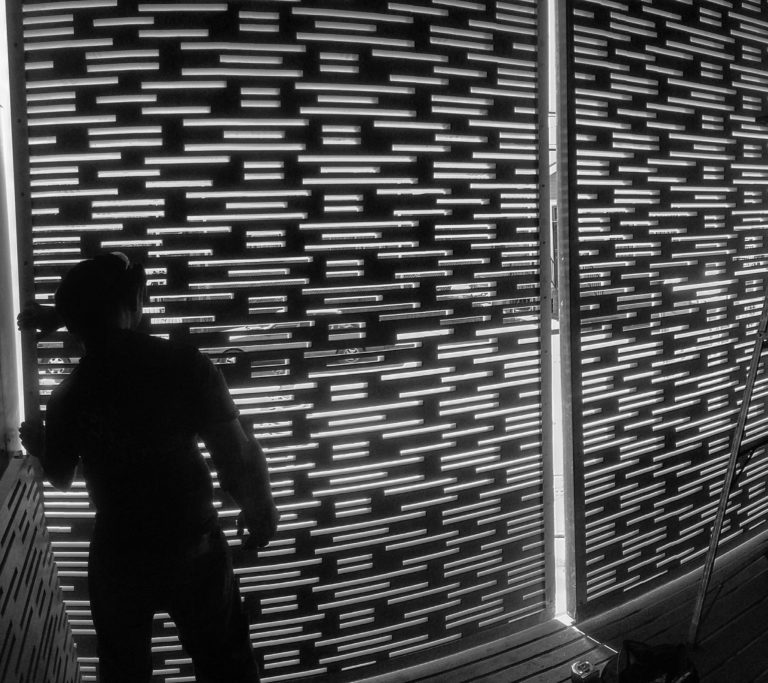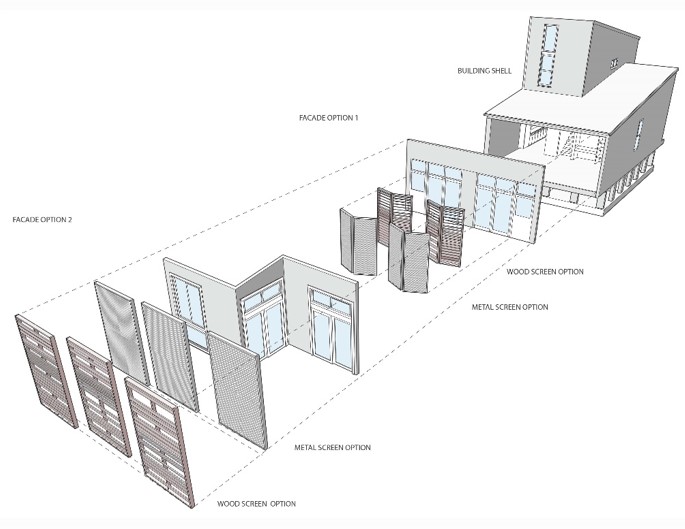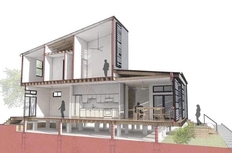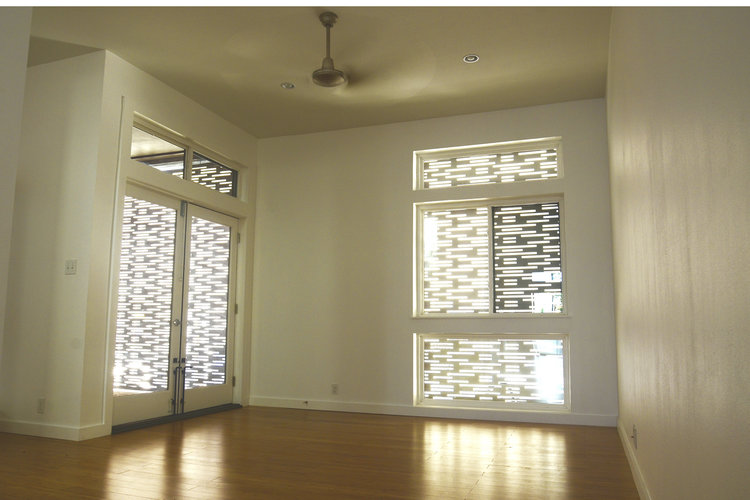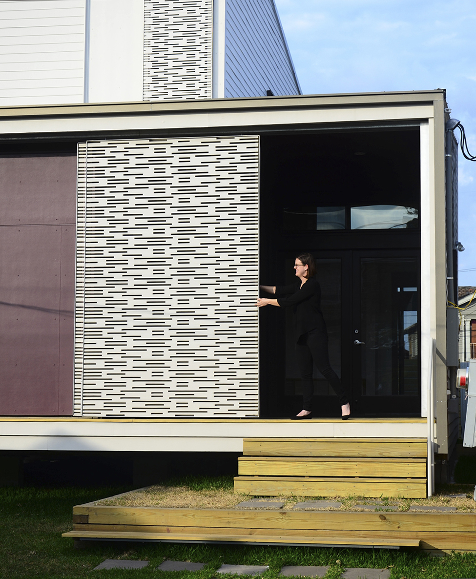 THIS SMALL AFFORDABLE HOME WAS DESIGNED AND BUILT AS PART OF TULANE UNIVERSITY’S URBANbuild PROGRAM. THE HOUSE WAS DESIGNED TO FUNCTION AS A EITHER A DUPLEX OR A SINGLE FAMILY HOME. THE FLEXIBLE FLOOR PLAN ALLOWED FOR EASY CONVERSION BETWEEN THESE OPTIONS AND WAS INTENDED AS A PROTOTYPE THAT COULD BE EASILY REPLICATED IN OTHER SIMILAR INFILL SITES. THE FRONT OF THE HOUSE FACES DUE WEST, NECESSITATING A SHADING SYSTEM. THE CUSTOM DESIGNED SLIDING SHADES CREATE A DYNAMIC PLAY OF LIGHT WHILE ALSO MITIGATING THE HOT AFTERNOON SUN.