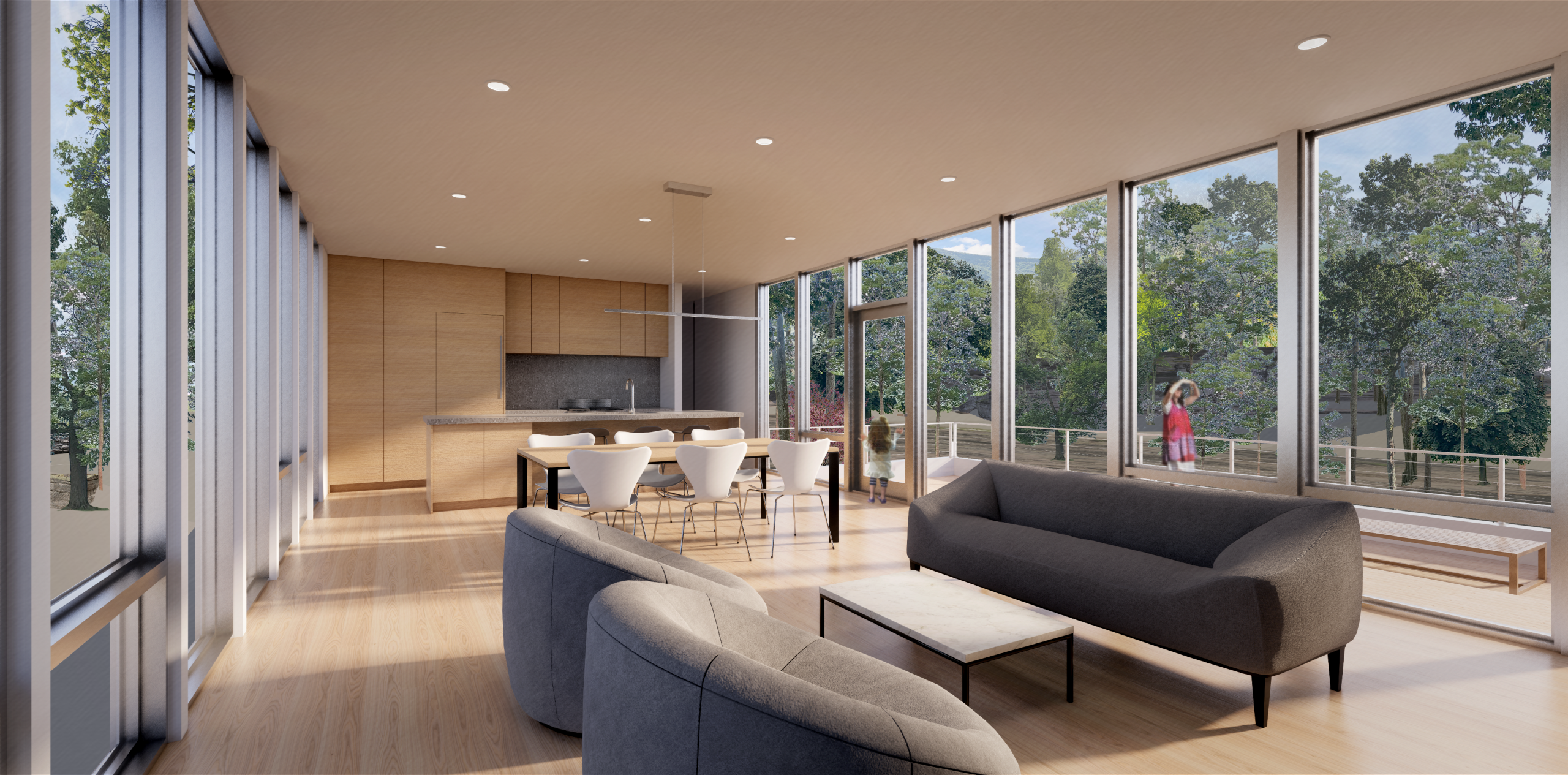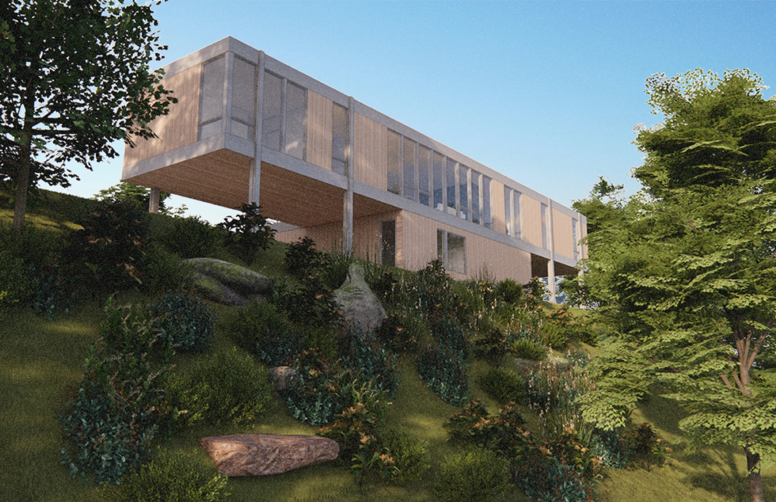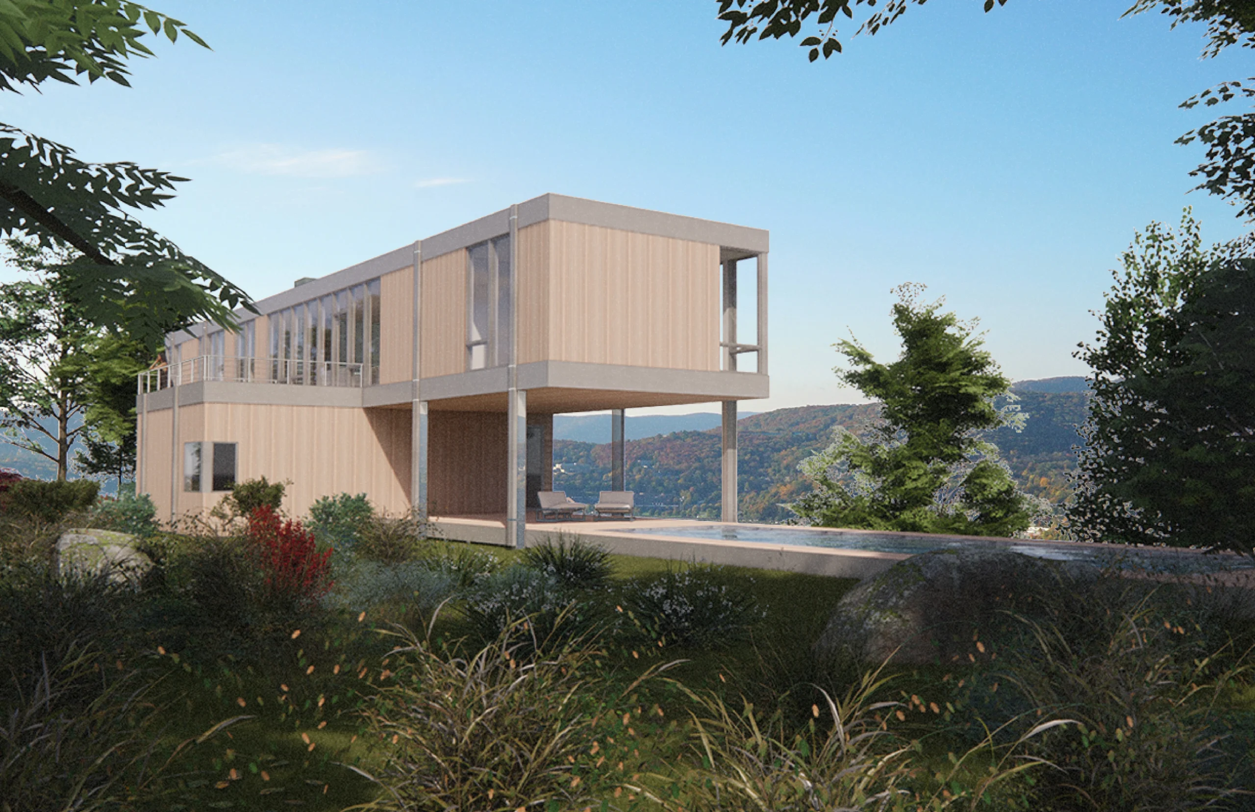 DESIGNED FOR A CLIFFSIDE SITE IN SAUGERTIES, THIS HOME EFFORTLESSLY FLOATS ABOVE THE PEAK OF A PRISTINE SITE WITH COMPLETELY UNOBSTRUCTED VIEWS ALONG THE NORTH AND SOUTH FACADES OF THE HOME . THE MAIN FLOOR OF THE HOUSE INCLUDES THREE BEDROOMS AND TWO BATHROOMS, ALONG WITH THE MAIN LIVING SPACE. THE GROUND FLOOR FEATURES SUPPORTING SPACES SUCH AS A GARAGE, LAUNDRY, STORAGE AND A FLEX ROOM. OPTIONAL ADDITIONS INCLUDE A POOL AND AN EXPANDED GARAGE/WORKSHOP SPACE.